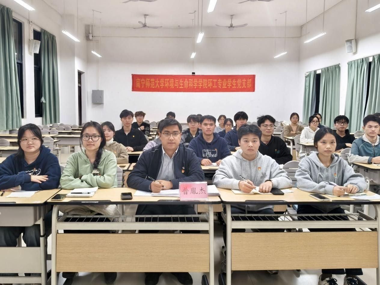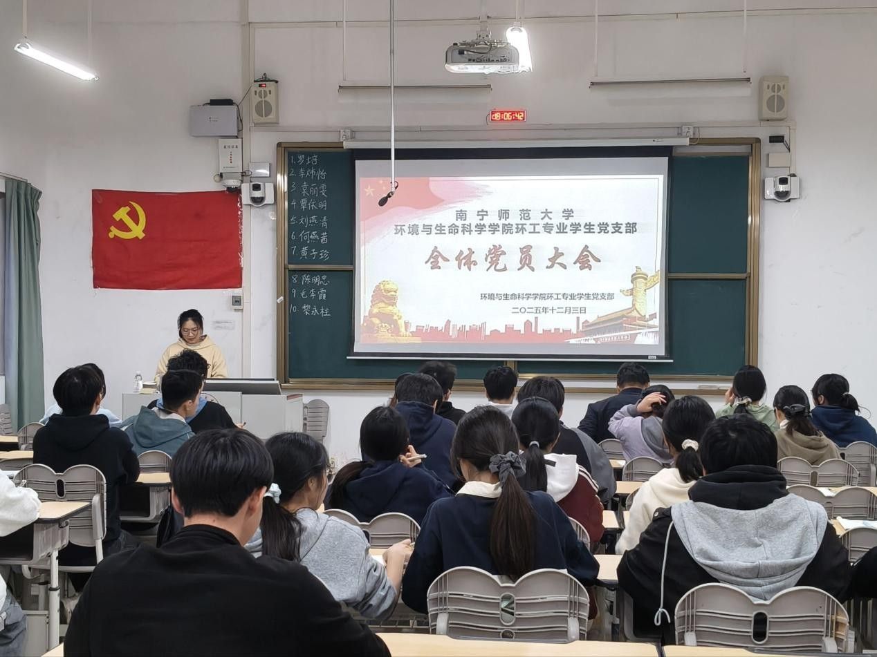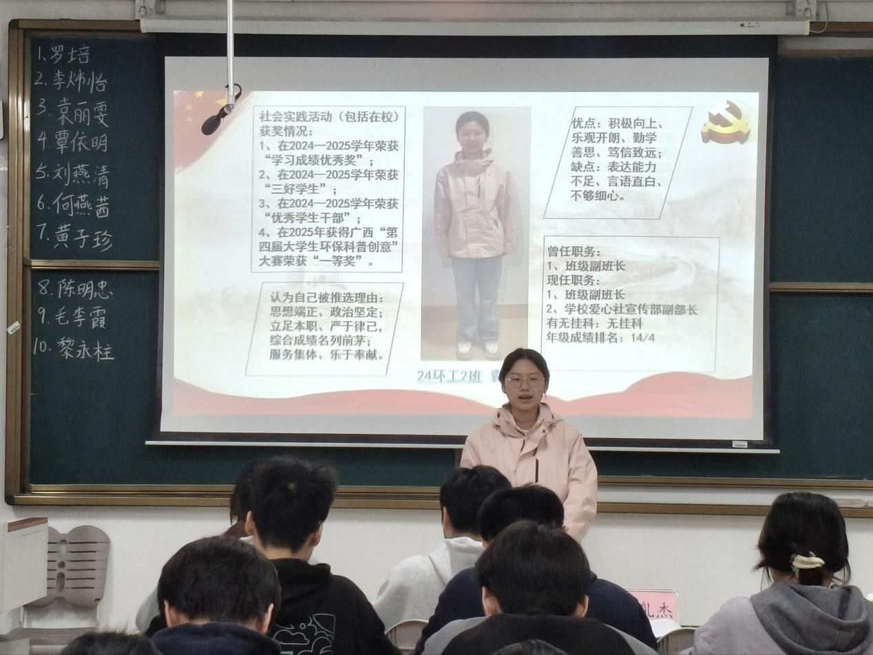 2025年12月3日晚,环境与生命科学学院环工专业学生党支部于武鸣校区1号教学楼120教室召开预备党员接收会议。支部书记普胤杰、全体党员及10名发展对象参会。