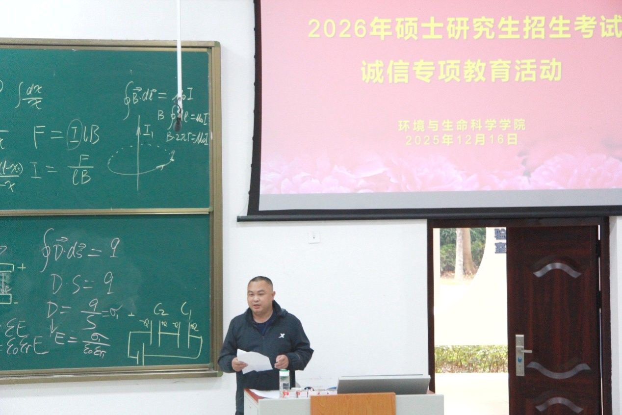 为深入推进学院学风建设,强化学生诚信意识和纪律观念,营造风清气正、严谨求实的校园学习气氛,环境与生命科学学院于12月16日中午在武鸣校区地海楼B109教室召开了诚信专项教育会议。会议上,学院党委副书记刘启满和辅导员甘佩萍面向全体备战2026年全国硕士研究生招生考试的考生作了诚信备考专题教育。