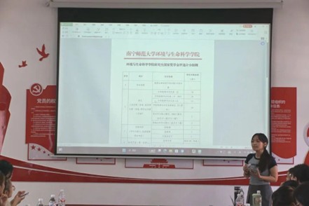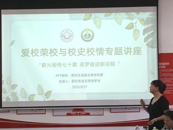 张梦冰同学通过PPT演示,生动讲述了南宁师范大学及环境与生命科学学院的发展历程。从学校与学院特色学科的起源、一脉相承的育人理念等办学传统,到近年来在科研领域取得的丰硕成果、人才培养质量的显著提升等重大成就,张梦冰同学均进行了细致讲解。此外,她还重点解读了校院 “十五五” 规划中的核心目标,涵盖学科建设升级、研究生培养模式创新、产学研深度合作等关键方向,帮助新生清晰认识到个人发展与校院集体发展的紧密联系,进一步增强了大家对学校和学院的认同感、归属感与自豪感。