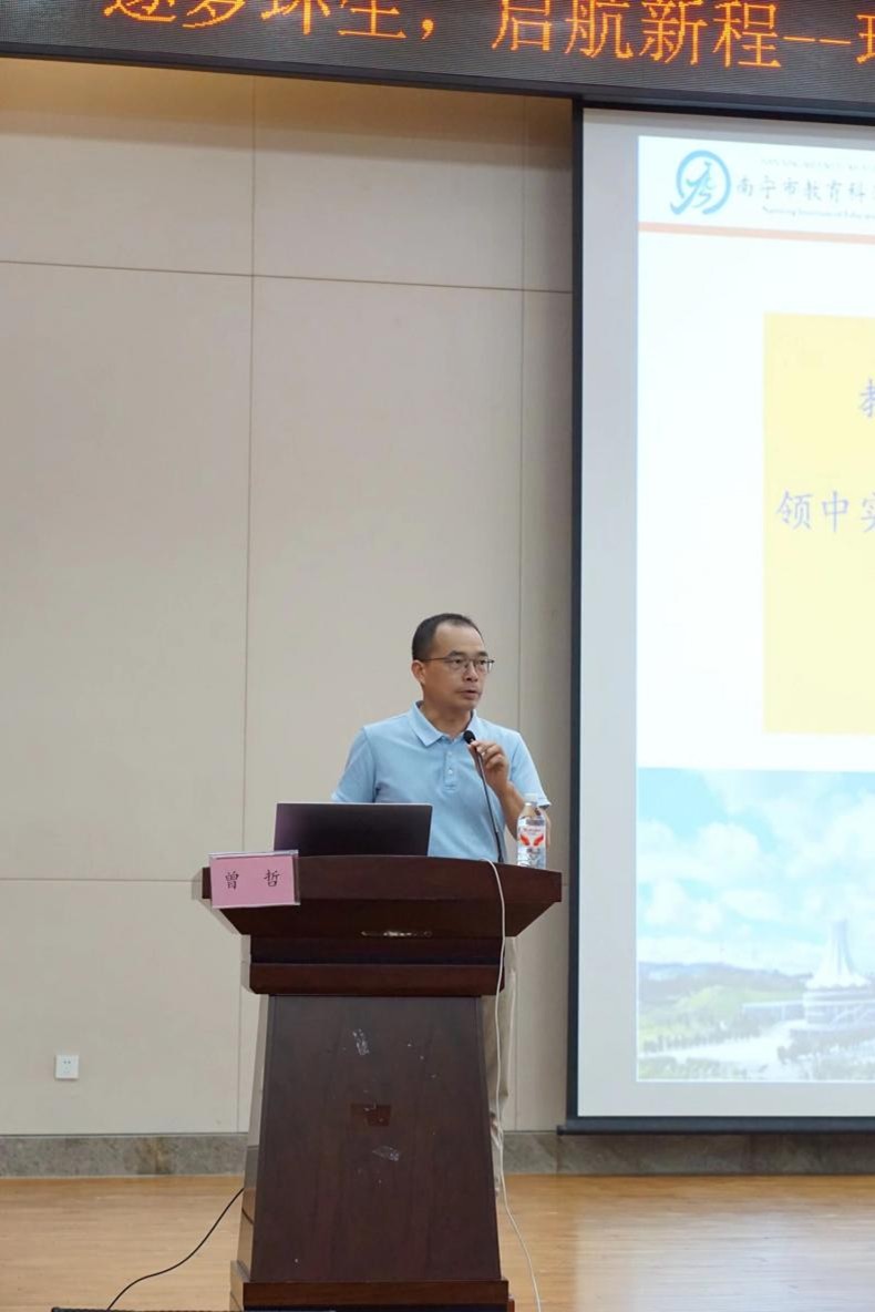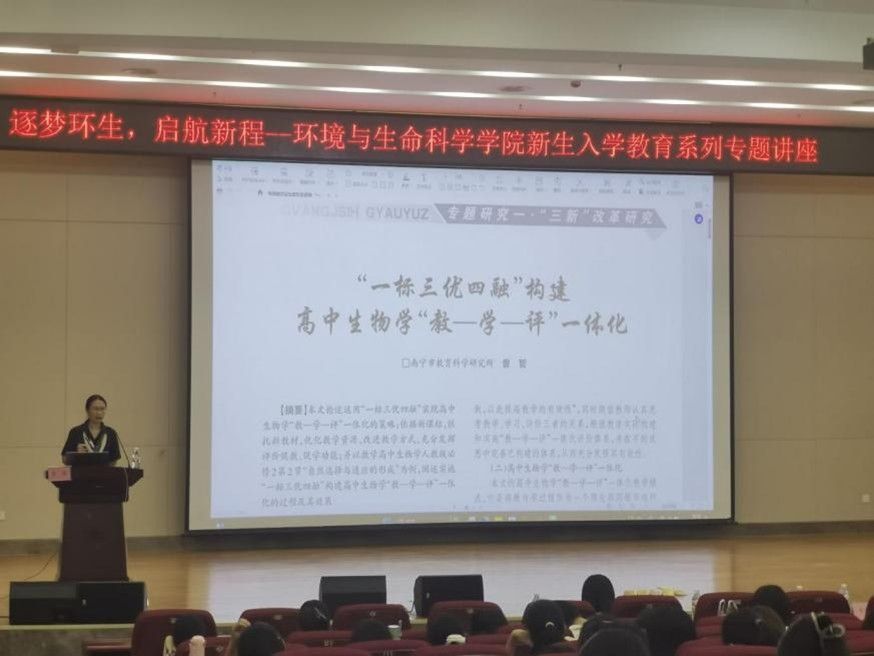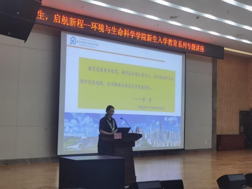 10月10日,环境与生命科学学院在武鸣校区图书馆一楼报告厅举办2025年“学术启航,领路前行”新生入学教育专题讲座。本次特邀南宁市教育科学研究所生物学科教研员,广西特级教师,正高级教师,南宁师范大学校外硕士研究生导师的曾哲老师开展讲座,曾哲老师长期致力于教育评价改革研究和初中高中新课程改革的实践研究,提出“一标三优四融”教学评一体化教学模式、拔尖创新人才初高中一体化培养途径等教学成果,推动区域教育质量的提升。此次应邀到来,主要以自己从教多年的经验为师生分享成长故事与职业感悟。本次活动由何英姿院长主持,党委书记韦东林、研究生班主任莫莉萍、硕士生导师张鹏飞等教师代表出席本次会议,参会人员还有学科教学(生物)研究生、生物科学专业全体本科生。