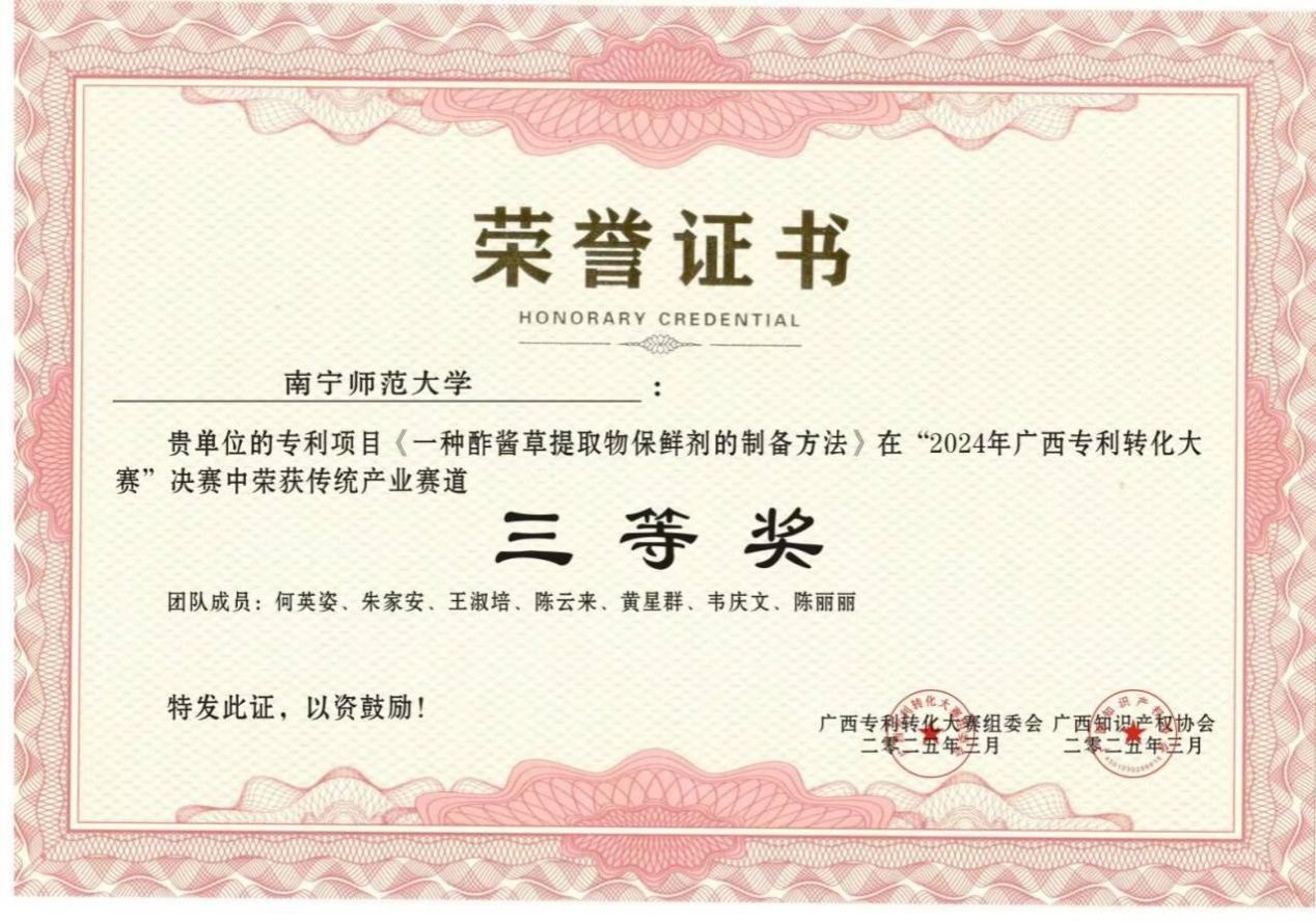 本次大赛得到全区各高校、科研机构及企业的积极响应与踊跃参与,参赛项目涵盖多个领域。赛事设置多赛道并行评选机制,各赛道奖项设置统一规范,其中一等奖各1名、二等奖各2名、三等奖各3名、优秀奖各4名。经过专家评审组多轮严格评审,最终评选出30个优秀获奖项目。。其中,我校环境与生命科学学院何英姿教授领衔的团队表现突出,该团队携 “一种酢浆草提取液保鲜剂的制备方法” 项目,历经初赛、复赛、决赛的层层筛选,凭借扎实的研究基础、创新的技术思路及良好的应用前景,最终在传统产业赛道中脱颖而出,荣获三等奖,为学校赢得了荣誉。