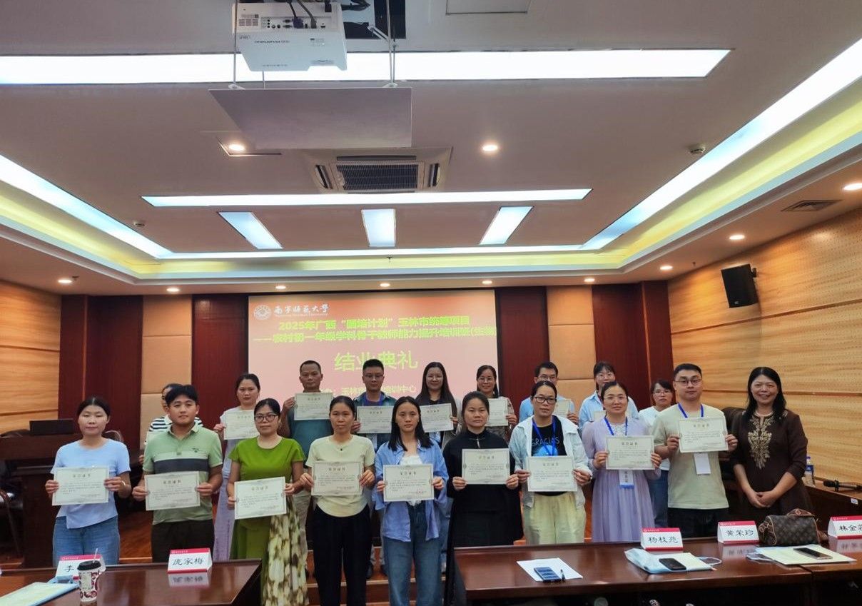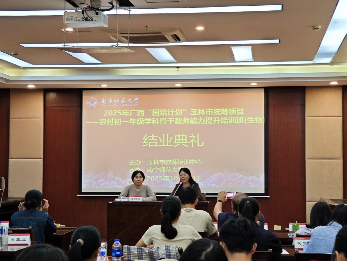 由玉林市教师培训中心主办、南宁师范大学环境与生命科学学院承办的广西2025年“国培计划””玉林市统筹项目—农村初一年级学科骨干教师能力提升培训班(生物)于10月25日圆满结束。来自玉林市的60名初中生物学教师参加了此次培训,南宁师范大学环境与生命科学学院院长何英姿出席结业典礼。
