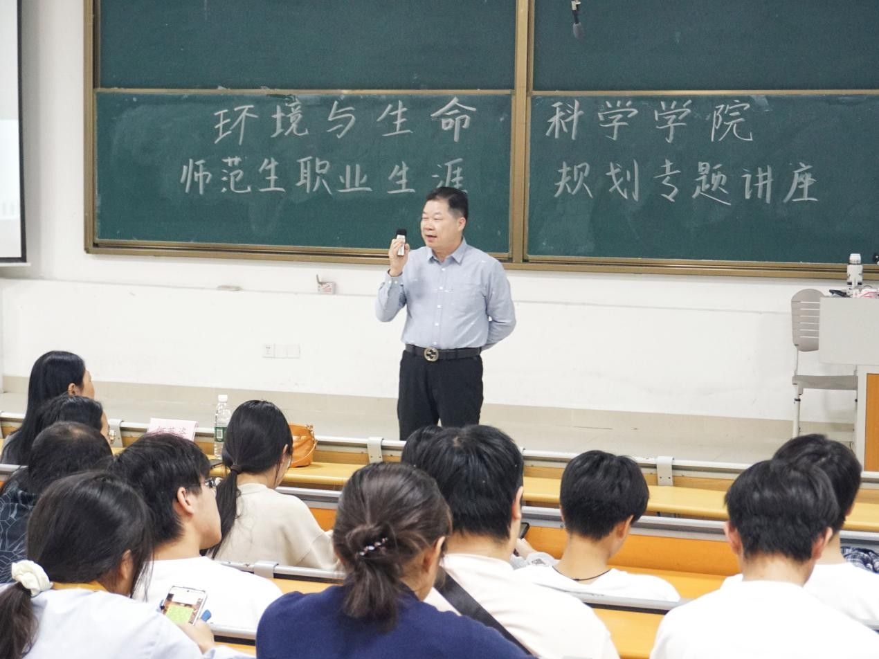 为助力同学们明确职业发展方向,科学规划学业与职业生涯,环境与生命科学学院于11月16日下午在武鸣校区1号教学楼115教室举行师范生职业生涯规划专题讲座。环境与生命科学学院院长何英姿主持活动,正高级教师陈振友应邀担任主讲,辅导员甘佩萍和2025级生物科学专业的同学到场聆听。