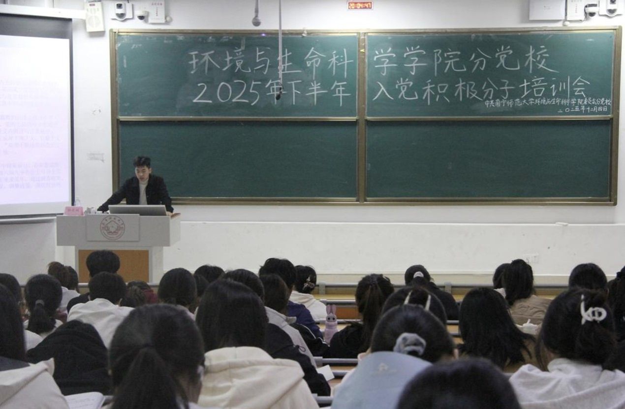 为保持党的先进性和纯洁性,确保新发展党员质量,环境与生命科学学院于12月4日晚在武鸣校区1号教学楼114教室组织开展入党积极分子培训班第六讲。本次授课由环境与生命科学学院辅导员骆亮城主讲,参会人员为2025年下半年入党积极分子及学院各专业党支部人员。