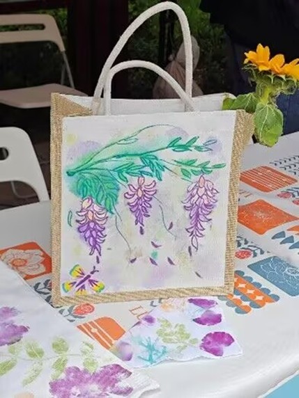 活动形式:参与者在工作人员指导下完成植物拓染全流程操作,将花草形态与色彩拓印于方棉布、帆布包、宣纸团扇之上。(注:作品可自行收藏)
